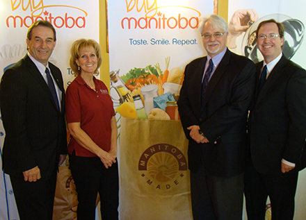Premier Greg Selinger (second from right) joins Craig Evans (right), Chief Executive Officer, Granny’s Poultry; Scott Chollak, Vice President Retail, Safeway; and Agriculture, Food and Rural Initiatives Minister Ron Kostyshyn (left) at the official launch of the Buy Manitoba campaign at the Safeway store on Henderson Highway.READ MORE
